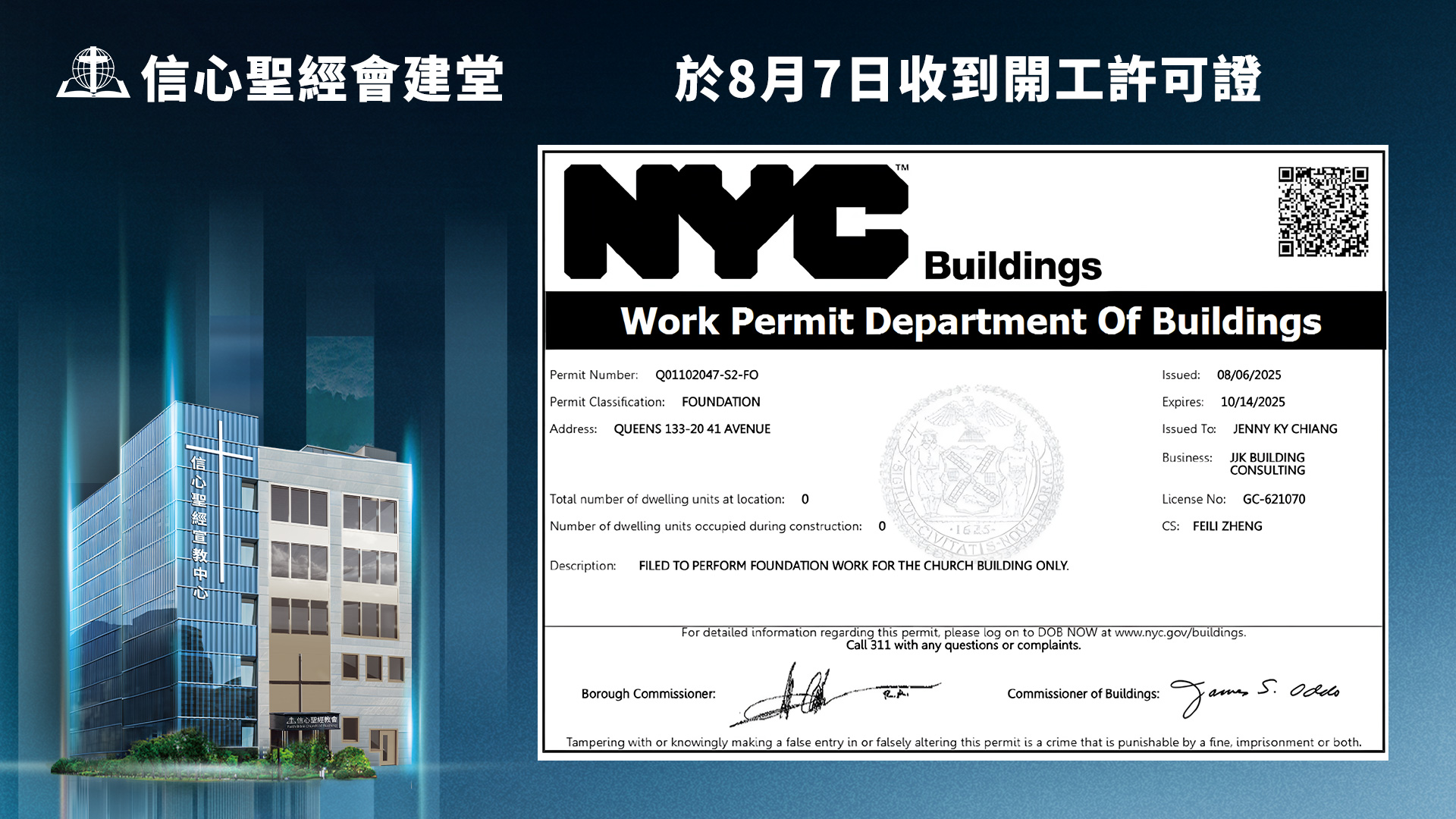 建堂近況更新:同心守望,工程即將開始!大樓的圖紙已得到樓宇局的通過。8月7日(周四)申請的開工紙(work permit)也已得批准。感謝神!也請為與旁邊鄰居的工程協議代禱!求主彰顯祂榮耀的大能。